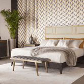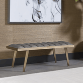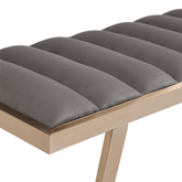 Banca con estructura metálica y asiento tapizado en tela tipo terciopelo. Contraste elegante, tacto suave y una presencia refinada que aporta carácter al espacio.