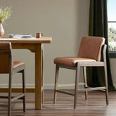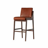 Banco tipo barstool de diseño vintage, forrado en cuero color café y marco de madera color marron. Altura al asiento: 0.77m