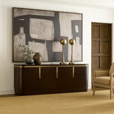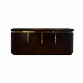 (detalles en cubierta) bufetero en madera de nogal, acabado poliester brillante, con detalle de borde en acero cromado color dorado, jaladeras en o acero cromado color dorado.