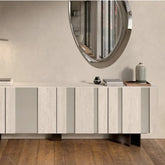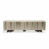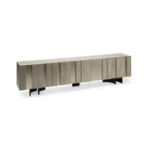 Bufetero con cubierta e insertos en ceramico km21 colosseo, armazon y cuerpo en titanio, patas en bronce, con cajon interior, en bronce y entrepaños de vidrio templado.