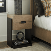 Buro de noche. Con dos cajones de cierre lento. Revestido en chapa de madera. En dos contrastantes tonos. Acabado cardeado.