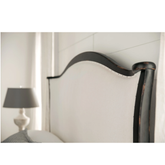 Cama king size con estructura de maple acabado espresso anticado/desvastado. Cabecera y piecera tapizadas en lino blanco con detalle decorativo de clavos.