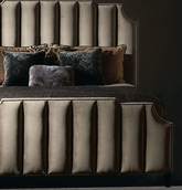 Cama king size con cabecera y piecera arqueadas, tapizada en terciopelo gris oscuro con capitoné vertical. Patas color espresso.