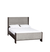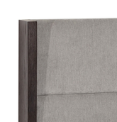 Cama queen size con marco y estructura en madera enchapada de acacia, tapizada en tela performance de alto rendimiento, resistente a manchas y fácil de limpiar.