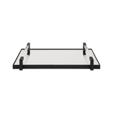Charola con acabado negro matte, barras suspendidas en acrílico transparente y cubierta inferior de espejo biselado.