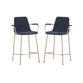 Counter stool con brazos, tapizado en tela color azul, estructura metalica color dorado, satinado. Altura al asiento: 0.66m. Altura al brazo: 0.82m
