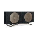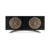 Credenza con cuatro puertas, en madera negra con detalles de metal martillado y tiradores plateados colgantes. Estante ajustable detrás de cada par de puertas panel trasero ventilado con pasacables y orificios para las manos