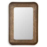 Espejo en aluminio fundido con acabado latón antiguo brillante, presenta un perfil profundamente inclinado y texturizado que muestra imperfecciones intencionales de estilo artesanal, otorgándole un carácter único y elegante a cualquier espacio.