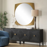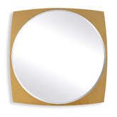 Espejo de acero inoxidable con acabado en latón antiguo con un espejo circular biselado al centro.
