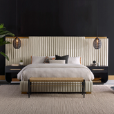 Cama king tapizada en tela color crema con detalles de latón.