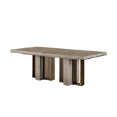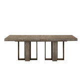 Mesa comedor enchapada en roble deslavado, con base de metal color cobre