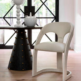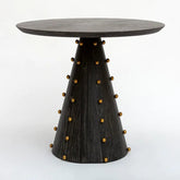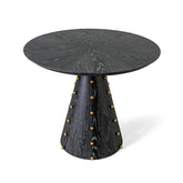 Mesa de comedor circular y base tipo prisma cónico, enchapado en ébano en color negro y detalle de pequeñas esferas doradas.