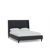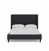 Cama queen size con aleros decorativos en respaldo. Base y respaldo tapizados en tela (Grado 1 Torrey, Cracked Pepper). Patas en madera acabado espresso.