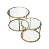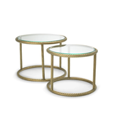 Mesas en acabado en latón vintage, aportando estilo atemporal en formas redondas y proporciones equilibradas crean un conjunto dinámico