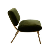 Silla de acento metálica en aluminio latonado, con asiento tapizado en tela tipo velvet. Su combinación de metal y tela suave la hace ideal para salas, oficinas o rincones especiales, agregando estilo y un toque de sofisticación práctica a tu espacio.