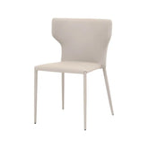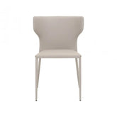 Silla de comedor, tapizada en cuero sintético tono gris claro en asiento y respaldo. Diseño en diamantes en respaldo. Patas en acero, diseño recto, recubrimiento en pintura electroestática.