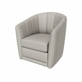Silla de acento giratoria tapizada en tela de terciopelo color beige claro. Incorpora detalles de costuras acanaladas en el respaldo y los brazos, que aportan textura y profundidad visual. Una pieza cómoda y envolvente, ideal para sumar calidez y un acento suave a salas, recámaras o espacios de lectura.