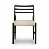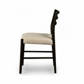 Silla de comedor, estructura en madera de nogal acabado ahumado, tapizada en tela de lino y aldogon texturizado color marfil.