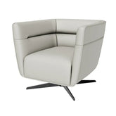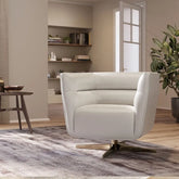 Silla de acento giratoria tapizada en piel color blanco, con estructura de pata metálica que aporta estabilidad y un contraste limpio. Su diseño versátil la hace ideal para salas, recámaras o espacios de lectura, sumando confort y un acento moderno sin perder sobriedad.