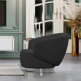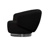 Silla de acento tapizada en tela negra con base giratoria en níquel plateado. Su diseño funcional y versátil la hace ideal para salas, oficinas o rincones de lectura, agregando un toque moderno y práctico a cualquier espacio.