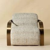 Sillón de acento tapizado en polyester color beige, con diseño redondeado y brazos de acero inoxidable en acabado dorado. Su forma suave y elegante lo hace ideal para cualquier sala o rincón, agregando un toque moderno y luminoso a tu espacio.