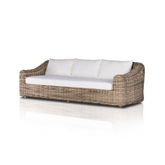 Sofa para exterior elaborado con teka platificadad, color natural claro, de alta resistencia y un patron tejido.